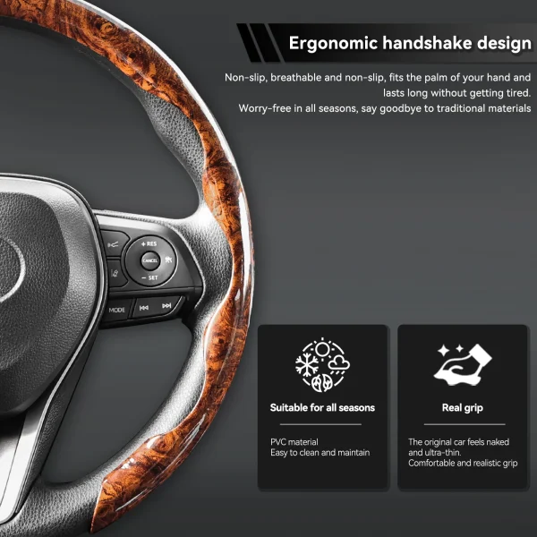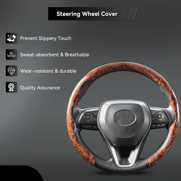 This cover doesn’t just protect—it elevates your interior. With a classy mahogany wood grain finish and a comfortable non-slip grip, it makes every drive feel more stylish and secure.