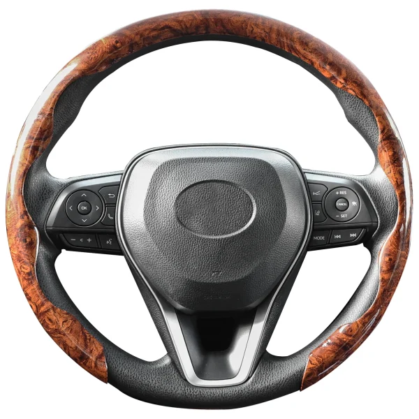 Add a touch of luxury and comfort to your drive with this mahogany wood grain steering wheel cover. Designed with a breathable, non-slip grip, it protects your steering wheel while giving your interior a classy, timeless look. Perfect for Toyota Corolla, Camry, RAV4, Prius, and any vehicle with a 14.5–15 inch steering wheel.